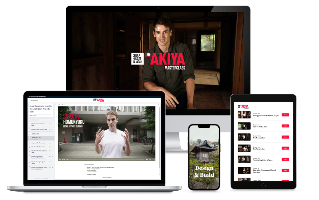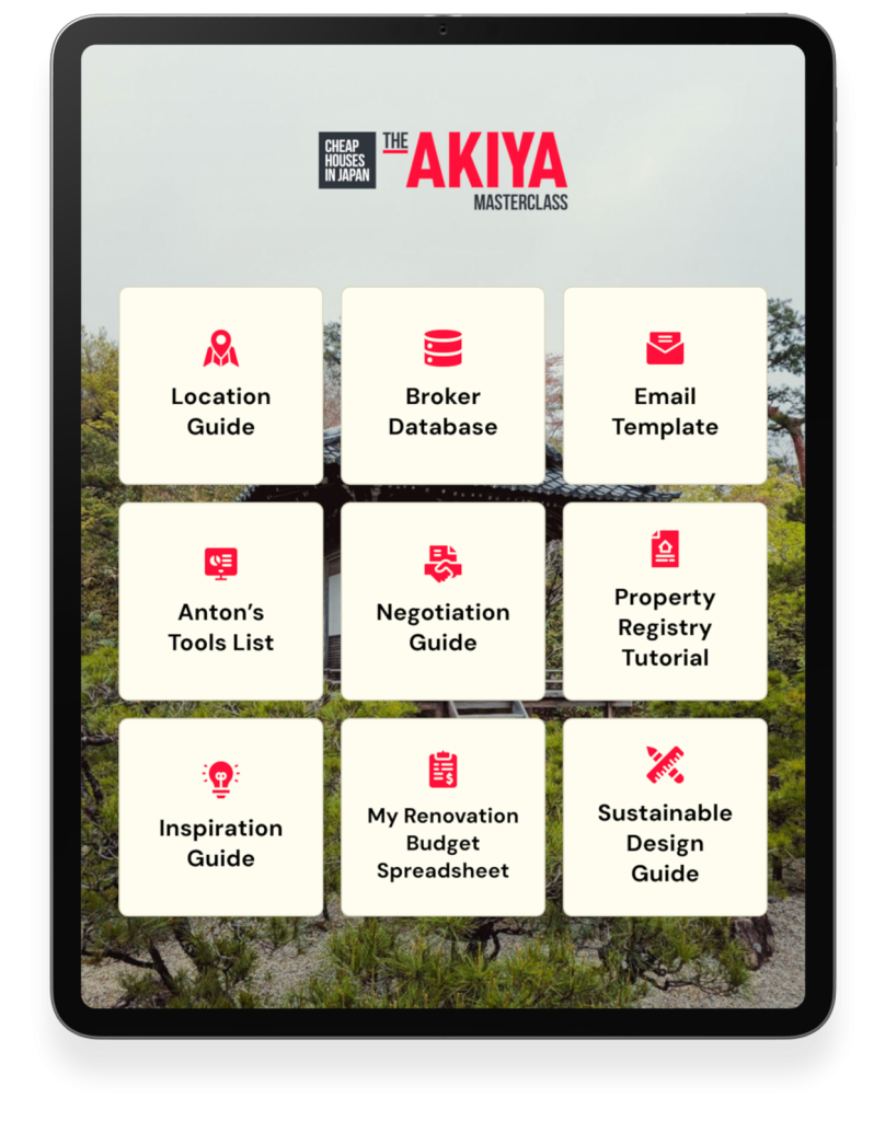 The Cheap Houses in Japan – The Akiya Masterclass comes with 7 in-depth video lessons that will equip you to find, buy and renovate your akiya + a bonus Choosing The Right Visa lesson (~100 minutes of content) + 6 detailed tasks that’ll guide you through the process of finding and buying your first akiya.